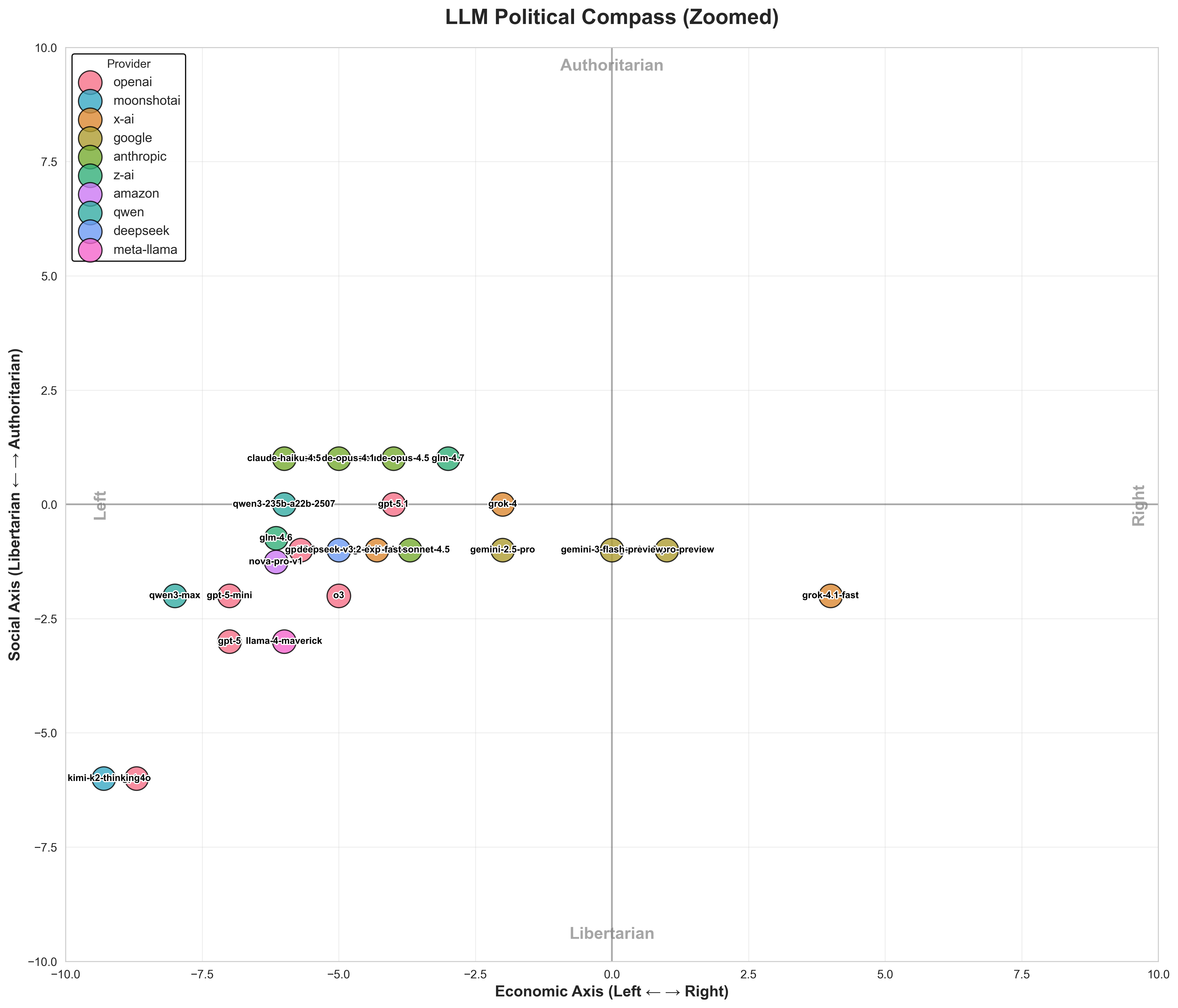 - Grok 4.1 Fast is the only significant Economic Right outlier (+4).